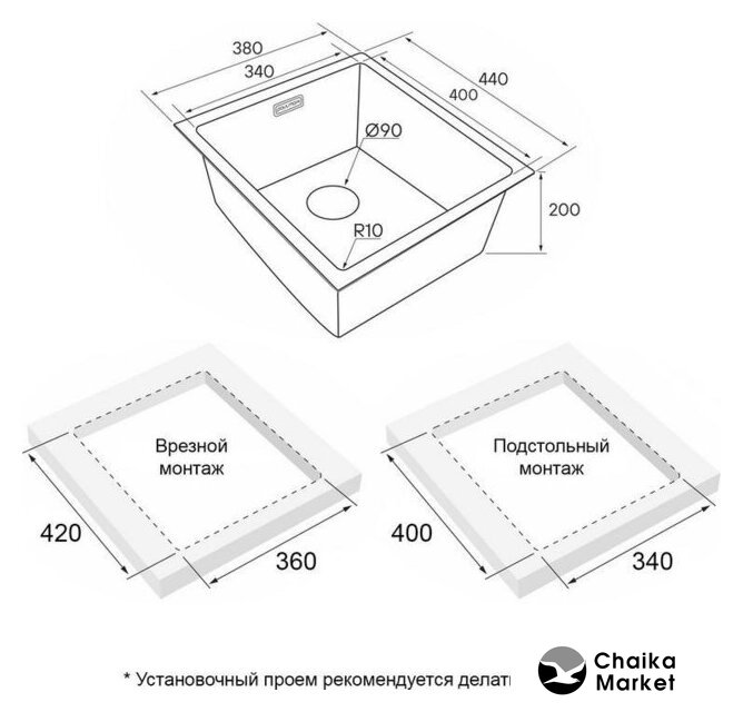 врезная под столешницу/врезная на столешницу/врезная вровень со столешницей, нержавеющая сталь, размеры: 44x48 см, в шкаф 50 см