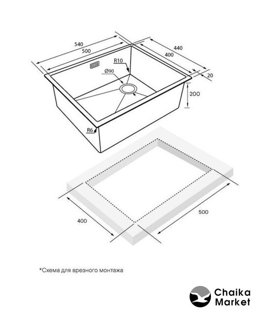 врезная на столешницу/врезная под столешницу/врезная вровень со столешницей, нержавеющая сталь, размеры: 54x44 см, глубина чаши: 20 см