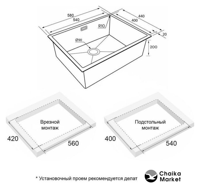 врезная на столешницу/врезная вровень со столешницей/врезная под столешницу, нержавеющая сталь, размеры: 44x54 см, в шкаф 60 см