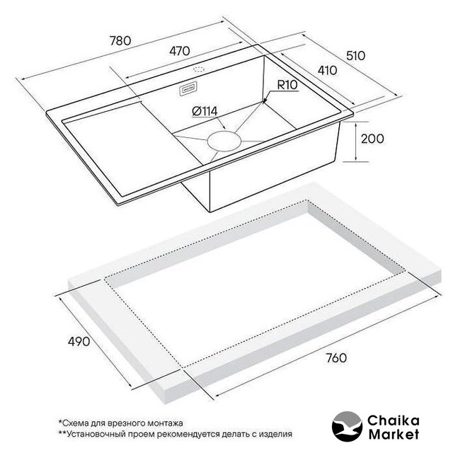 врезная на столешницу/врезная вровень со столешницей, нержавеющая сталь, размеры: 78x51 см, глубина чаши: 20 см, в шкаф шириной от 50 см