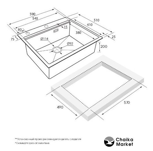 врезная на столешницу/врезная вровень со столешницей, нержавеющая сталь, размеры: 51x59 см, в шкаф 60 см
