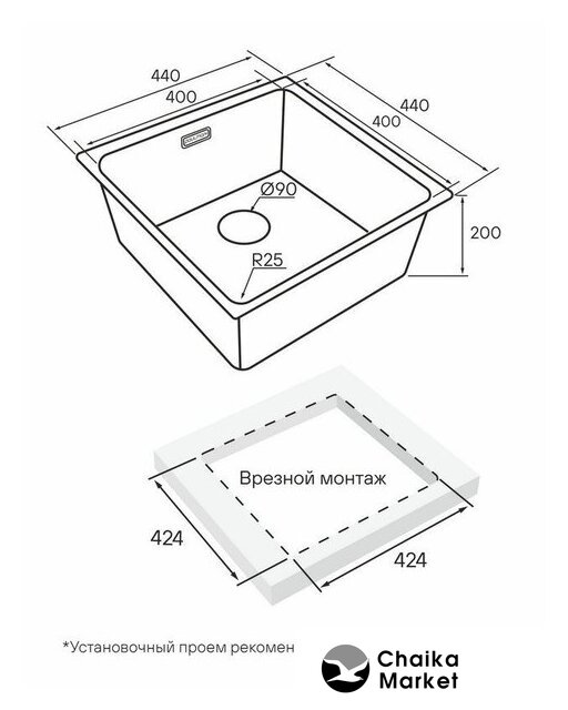 врезная на столешницу/врезная под столешницу/врезная вровень со столешницей, нержавеющая сталь, фактура: сатин, размеры: 50.5x55 см, глубина чаши: 20 см, в шкаф шириной от 60 см