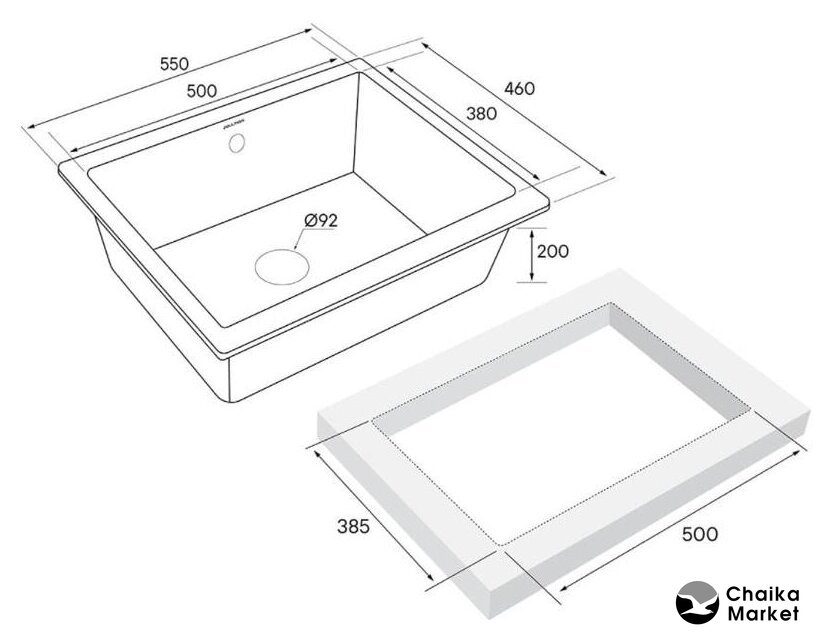 врезная на столешницу, искусственный камень, размеры: 61x50 см, глубина чаши: 19 см, в шкаф шириной от 60 см