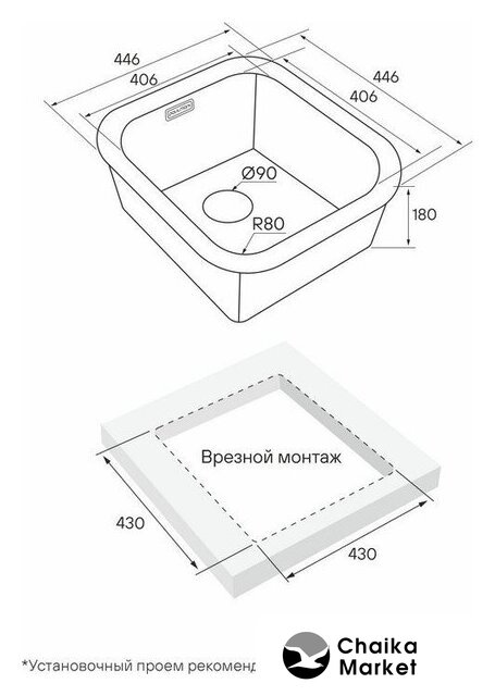 врезная на столешницу, нержавеющая сталь, фактура: матовая, размеры: 50x50 см, глубина чаши: 20 см, в шкаф шириной от 50 см
