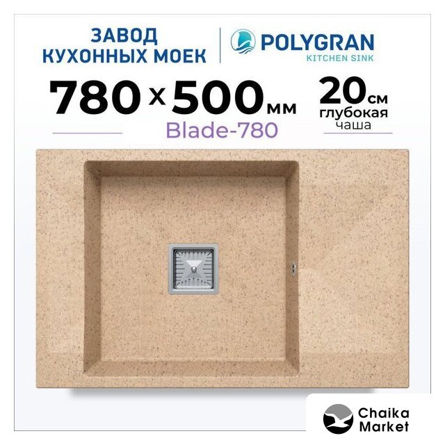 врезная на столешницу, искусственный камень, размеры: 78x50 см, глубина чаши: 20 см, в шкаф шириной от 60 см