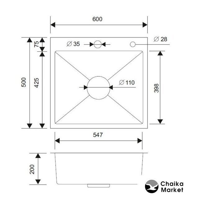 врезная на столешницу, нержавеющая сталь, фактура: матовая, размеры: 55x51 см, глубина чаши: 20 см, в шкаф шириной от 60 см