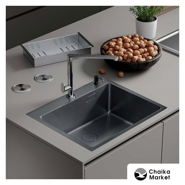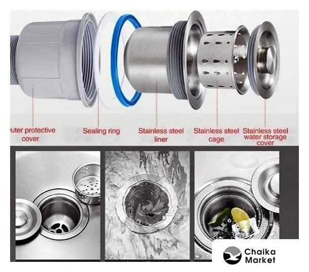 Комплектация | сифон с гофрой, коландер из нержавеющей стали, дозатор для моющих средств, корзинчатый вентиль, декоративная накладка, 2 заглушки на отверстия, комплект креплений к столешнице |