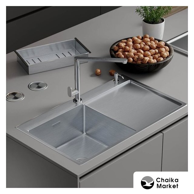 Комплектация | сифон с гофрой, коландер из нержавеющей стали, дозатор для моющих средств, корзинчатый вентиль, 2 заглушки на отверстия, комплект креплений к столешнице |