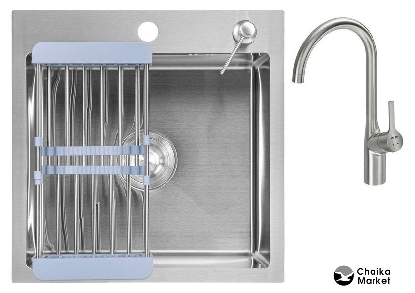 Комплектация | Мойка кухонная Saniteco 4848 (с сифоном, дозатором и коландером); Смеситель AM.PM Spike F9S07011 (сатин) |
