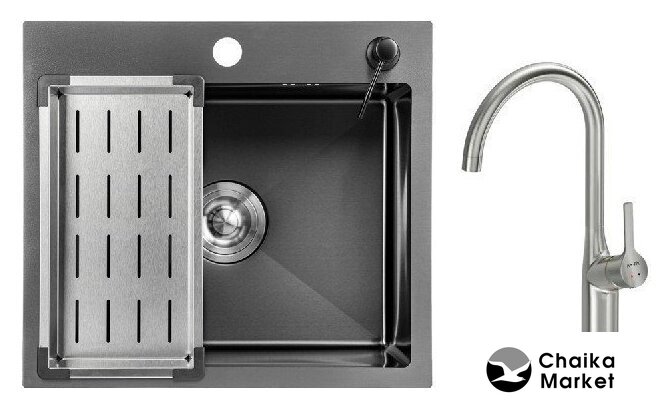 Комплектация | Мойка кухонная Saniteco 5045 Nano (с сифоном, дозатором и коландером); Смеситель AM.PM Spike F9S07011 (сатин) |