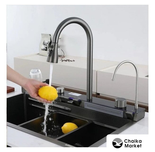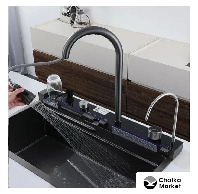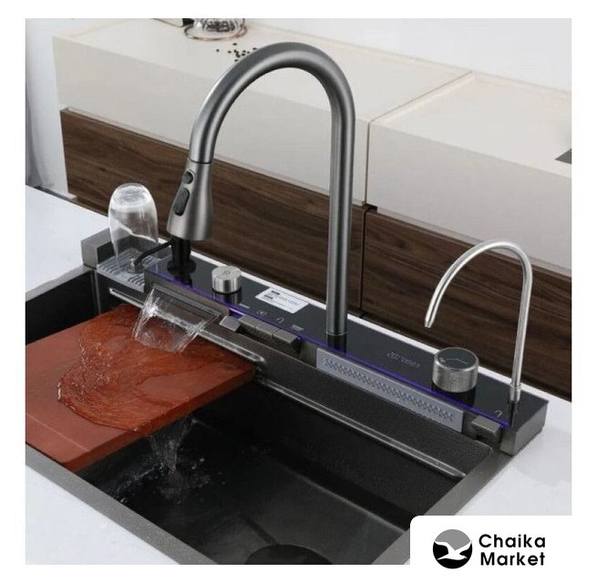 Комплектация | мультифункциональный смеситель с дисплеемдозаторразделочная доскаколандер угловойколандер с выпускомсифон |