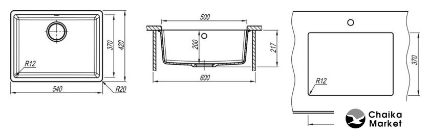 врезная на столешницу/врезная под столешницу, искусственный камень, размеры: 54x42 см, в шкаф 60 см