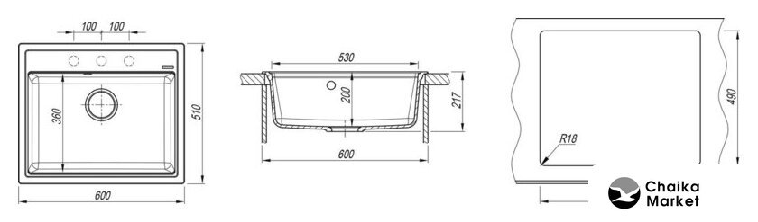 врезная на столешницу, нержавеющая сталь, фактура: матовая, размеры: 51x58 см, глубина чаши: 18 см