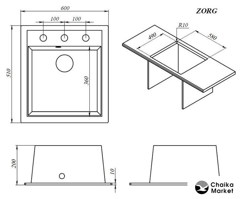 врезная на столешницу, искусственный камень, размеры: 60x51 см, в шкаф 60 см