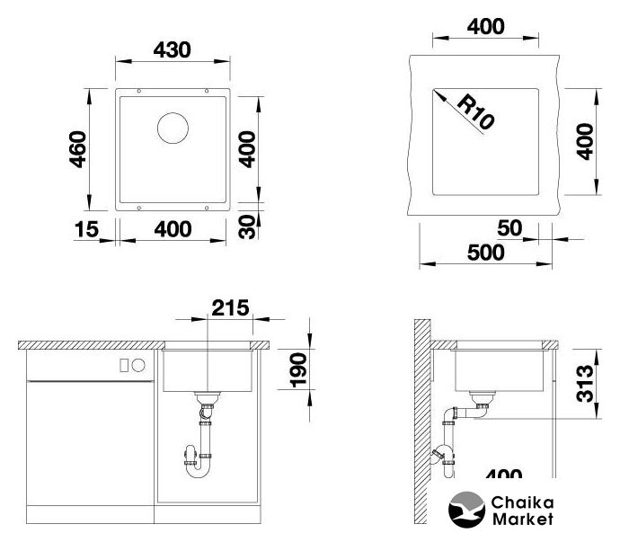 врезная под столешницу, искусственный камень, размеры: 43x46 см, в шкаф 50 см