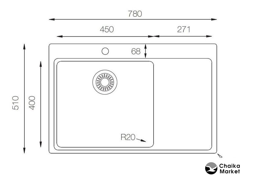 врезная на столешницу, нержавеющая сталь, размеры: 50x50 см, глубина чаши: 20 см