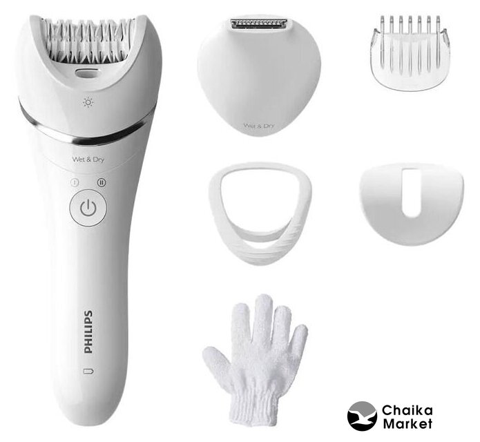 эпилятор, количество режимов: 2, массажер, насадка для бритья, триммер, подсветка, питание от аккумулятора/батареек