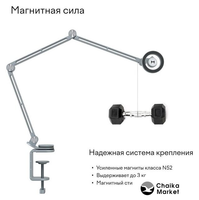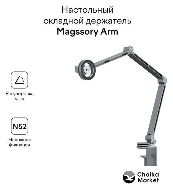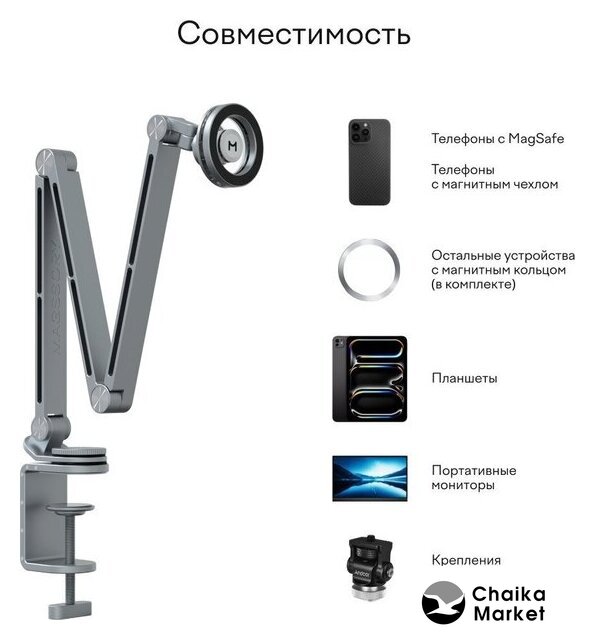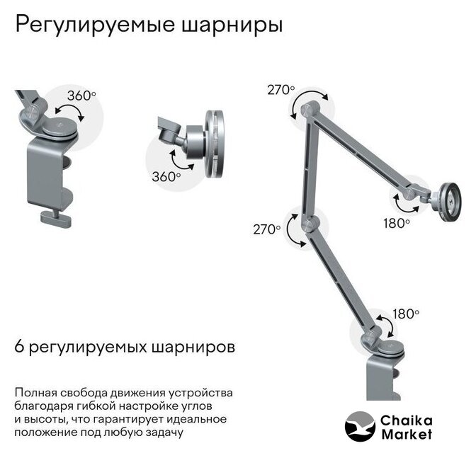 | Особенности | Полная свобода движения устройства благодаря гибкой настройке углов и высоты, что гарантирует идеальное положение под любую задачу. Сила крепления до 3 кг. |