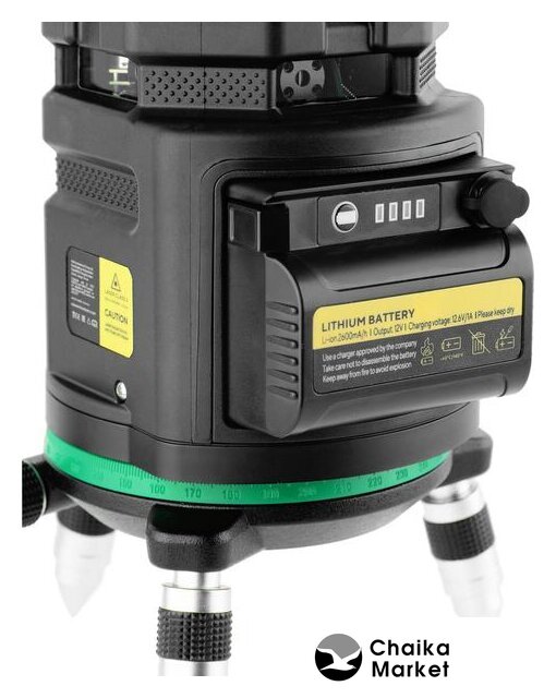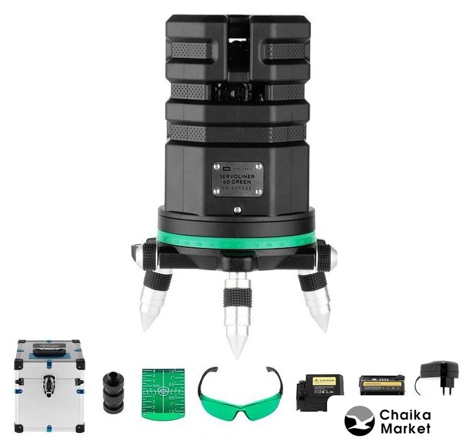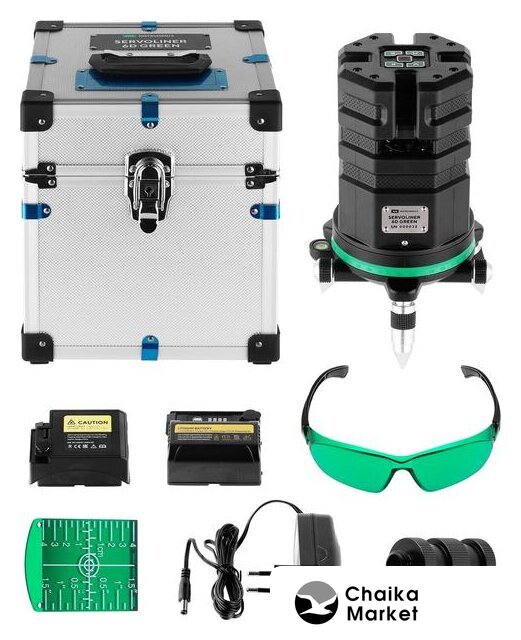 Комплект поставки | - Лазерный уровень- Литиевый аккумулятор- Зарядное устройство- Лазерные очки- Магнитная мишень- Винт-удлинитель- Батарейный отсек- Кейс- Руководство по эксплуатации |