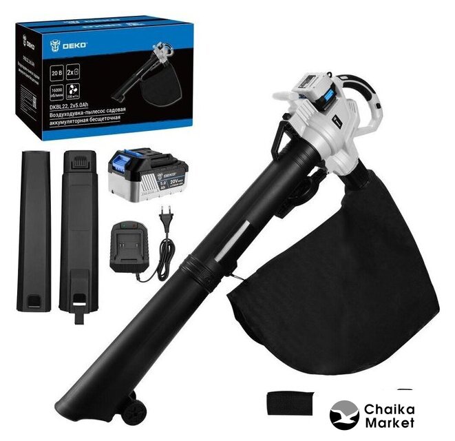 | Комплектация | - Корпус воздуходувки – 1 шт.- Верхняя насадка – 1 шт.- Нижняя насадка (нижняя насадка с колесами, нижняя насадка) – 2 шт.- Мусоросборник – 1 шт.- Аккумулятор 5.0 А·ч – 2 шт.- Зарядное устройство – 1 шт.- Плечевой ремень – 1 шт.- Руководство по эксплуатации- Коробка |