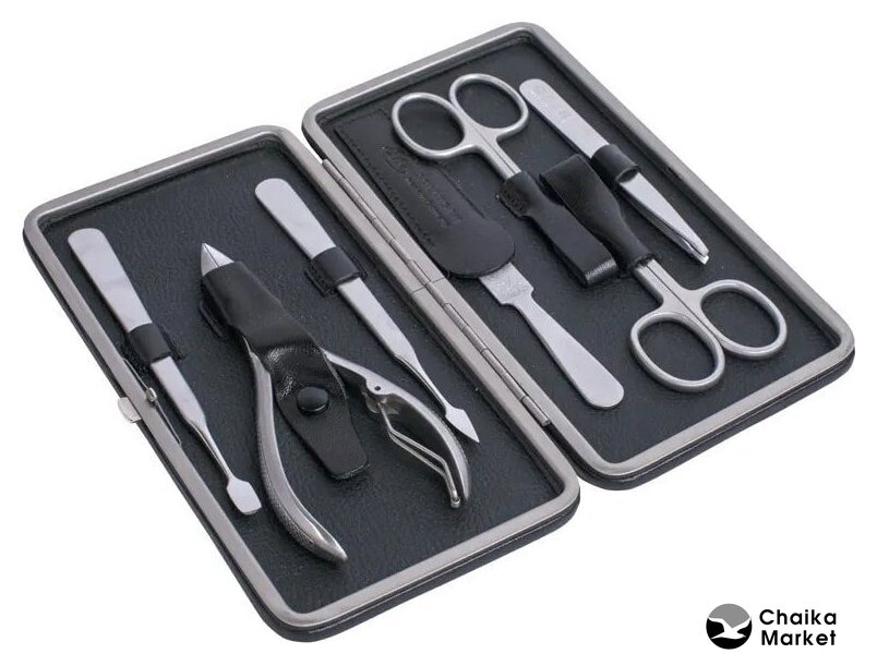 | Комплектация | ножницы для кутикулы и ногтей, два шабера в виде копья и лопатки, наклонный пинцет, металлическая пилочка и кусачки для ногтей |