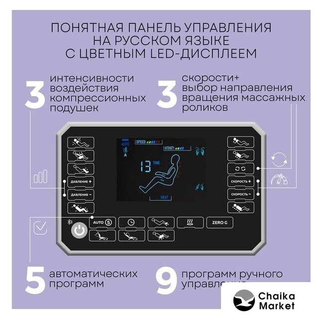 роликовый массаж, воздушный массаж, разминающий массаж, растягивание, вибромассаж, питание: сеть 220В