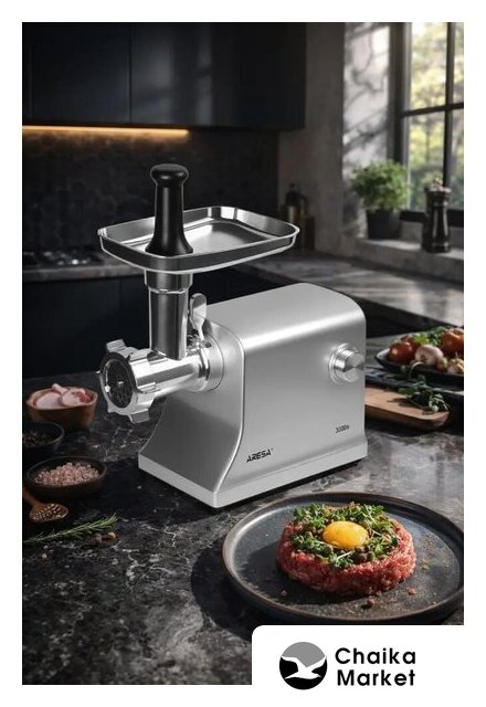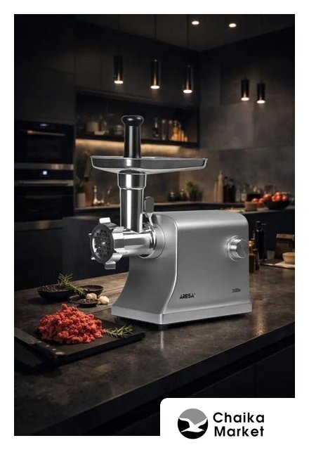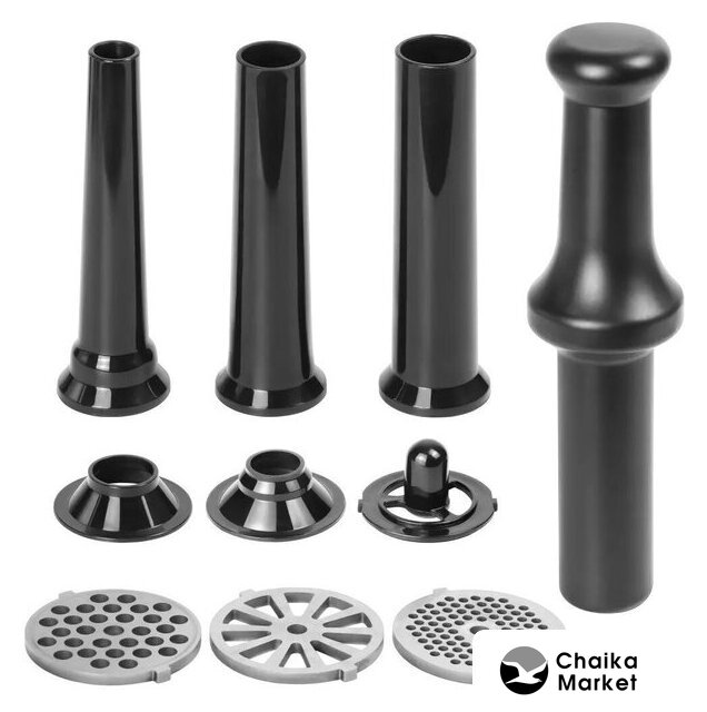 | Полная комплектация | фиксирующая гайка, решётка для помола (7 мм), решётка для помола (4 мм), решётка для рубленого мяса, самозатачивающийся режущий нож, шнек, загрузочная горловина, загрузочный лоток, толкатель, 3 насадки для приготовления колбасок/сосисок (14/20/22 мм), насадка для приготовления кеббе, инструкция |