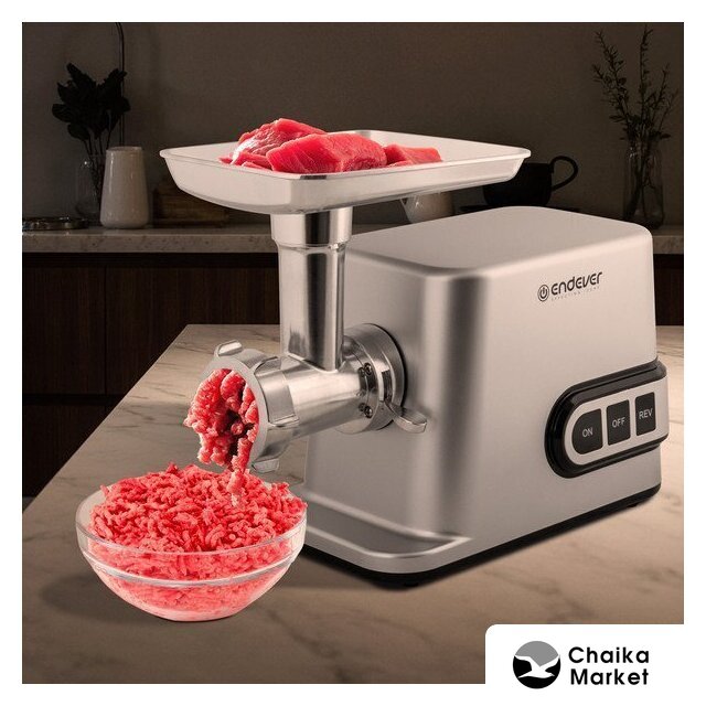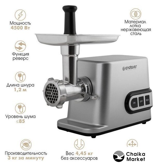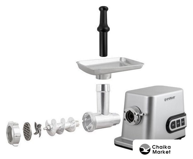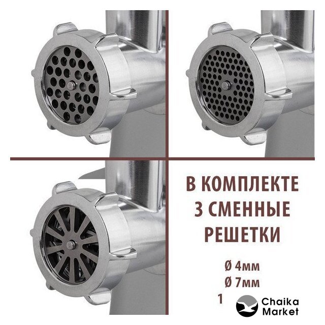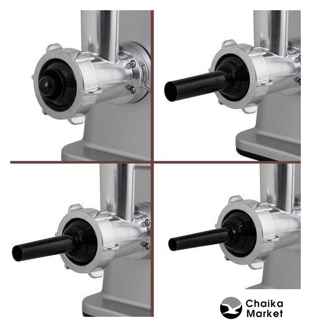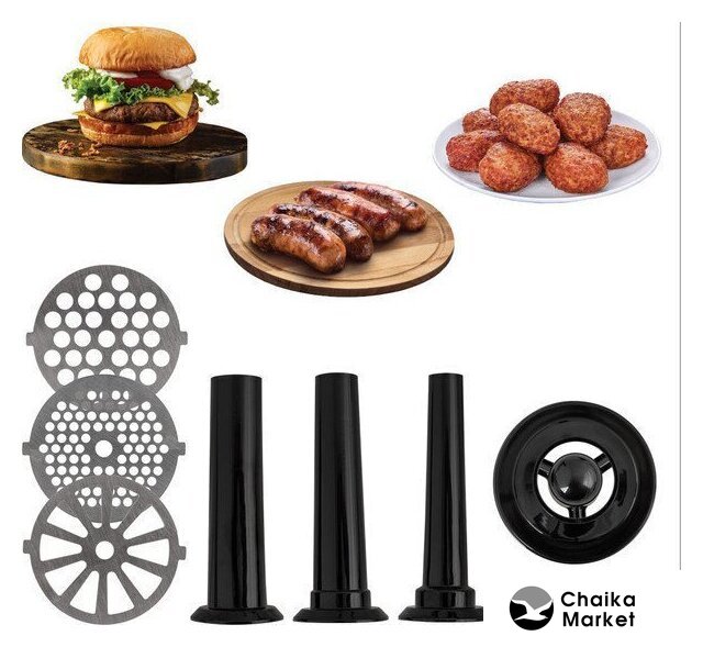 | Полная комплектация | мясорубка, металлический загрузочный лоток, нож, толкатель, фиксирующая гайка, шнек, 3 формовочных диска, насадки для кеббе и домашней колбасы, инструкция |