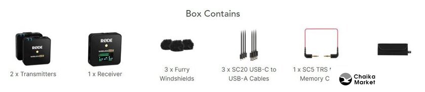 | Комплект поставки | - приемник- два передатчика- съемная ветрозащита- аудиокабель (3.5 мм - 3.5 мм)- три USB-кабеля для зарядки (USB Type-C - USB Type-A)- чехол- документация |