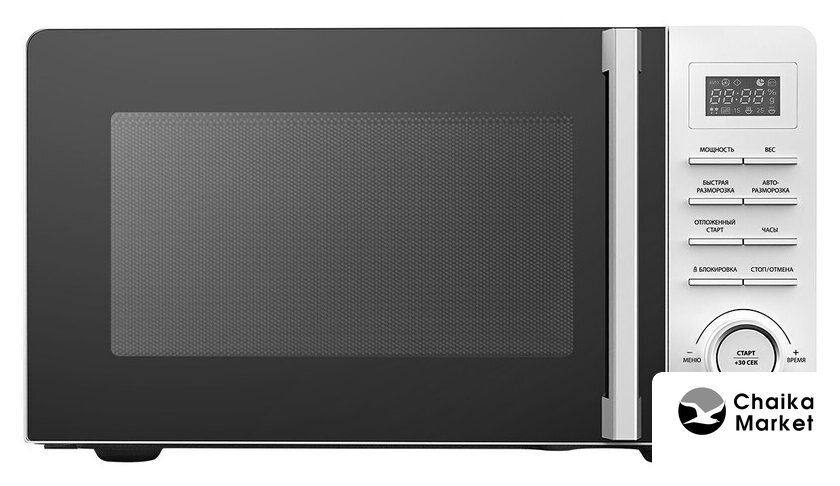 отдельностоящая, микроволны (соло), объем 20 л, выходная мощность микроволн 800 Вт, управление механическое, цвет белый