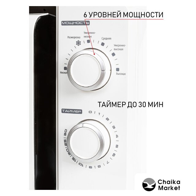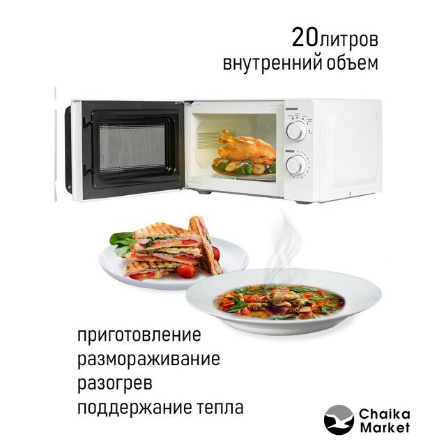 отдельностоящая, микроволны (соло), объем 20 л, выходная мощность микроволн 700 Вт, управление механическое, цвет белый