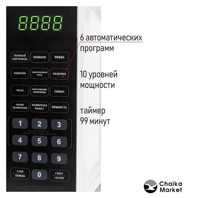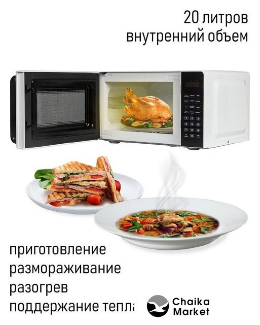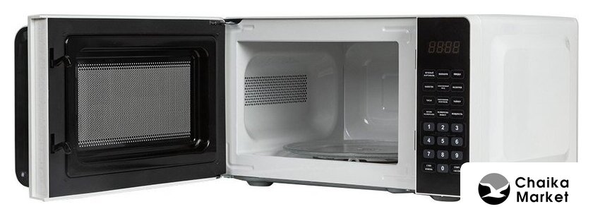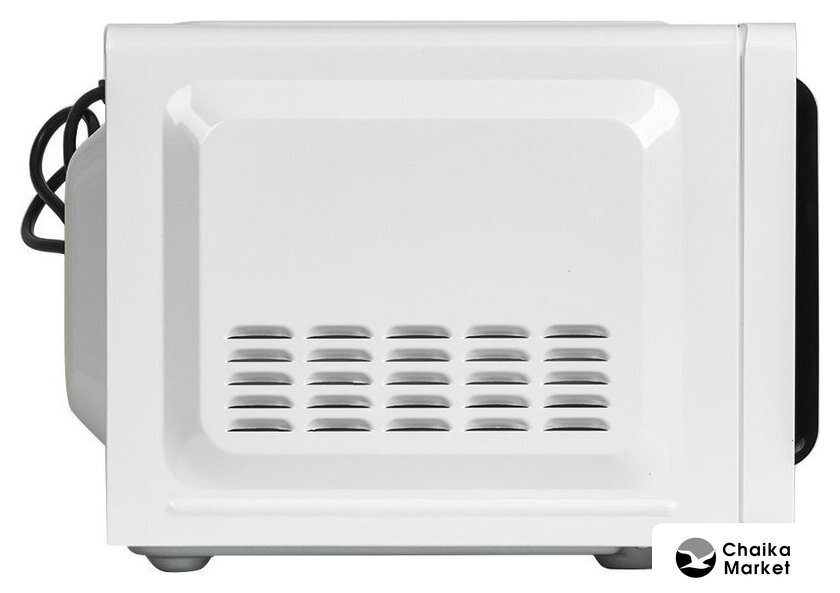 отдельностоящая, микроволны (соло), объем 20 л, выходная мощность микроволн 800 Вт, управление механическое, цвет белый