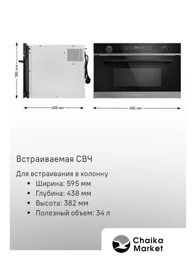 встраиваемая, микроволны и гриль, объем 25 л, управление сенсорное, автоприготовление, авторазмораживание, цвет черный