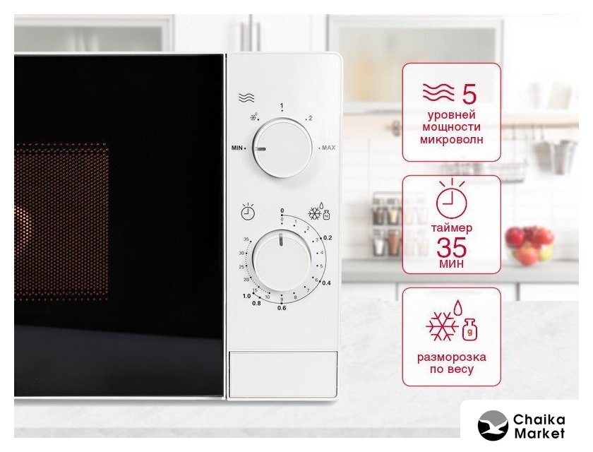 отдельностоящая, микроволны (соло), объем 20 л, выходная мощность микроволн 800 Вт, управление механическое, цвет белый