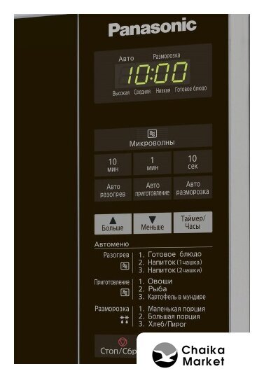 отдельностоящая, микроволны (соло), объем 23 л, выходная мощность микроволн 800 Вт, управление электронное, автоприготовление, авторазмораживание, цвет нержавеющая сталь/черный