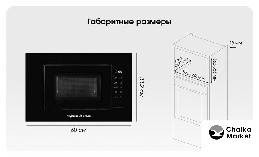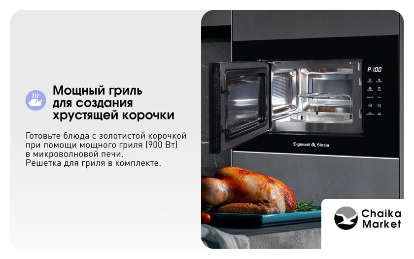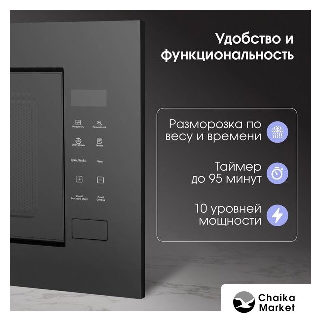 встраиваемая, микроволны и гриль, объем 25 л, выходная мощность микроволн 900 Вт, управление электронное, автоприготовление, авторазмораживание, цвет черный