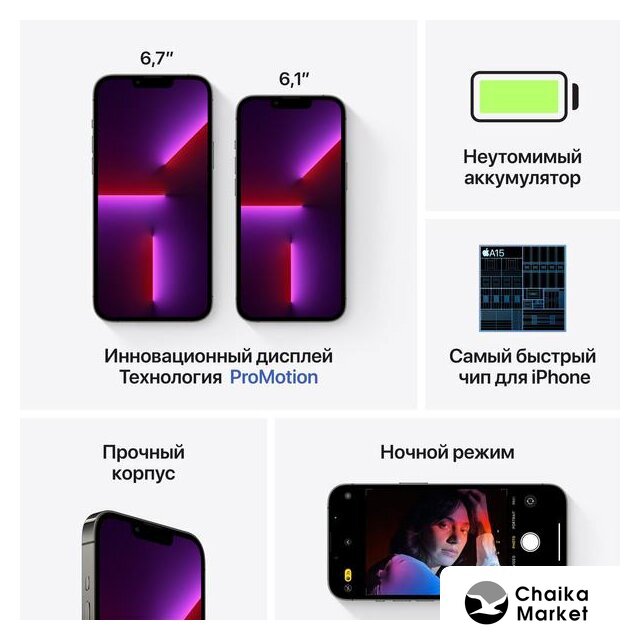 Apple iOS, экран 6.7" OLED (1284x2778) 120 Гц, Apple A15 Bionic, ОЗУ 6 ГБ, память 128 ГБ, камера 12 Мп, аккумулятор 4352 мАч, 1 SIM (nano-SIM/eSIM), влагозащита IP68