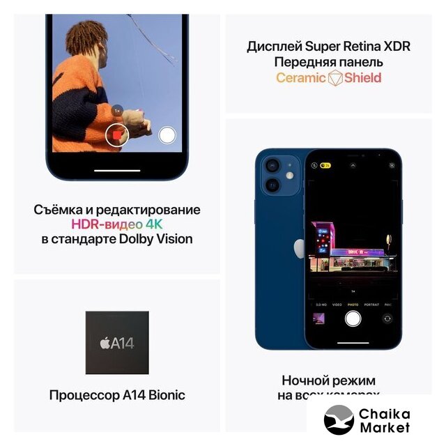 смартфон, Apple iOS, экран 5.4" OLED (1080x2340) 60 Гц, Apple A14 Bionic, ОЗУ 4 ГБ, память 256 ГБ, камера 12 Мп, моноблок, влагозащита IP68
