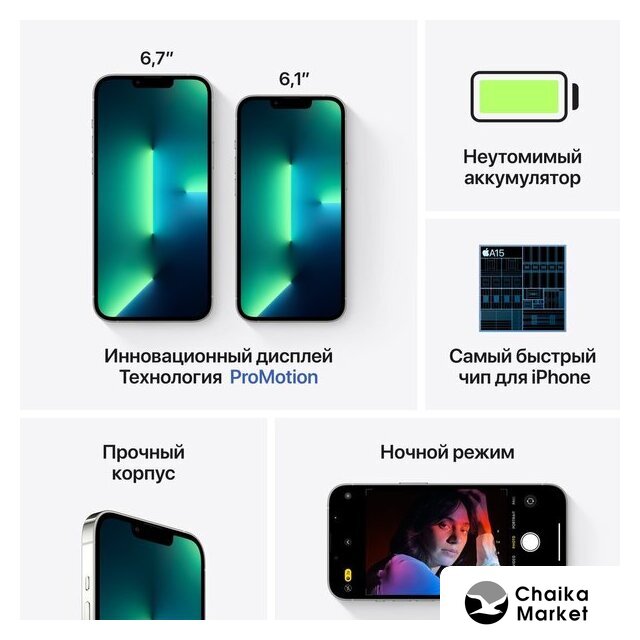 смартфон, Apple iOS, экран 6.7" OLED (1284x2778) 120 Гц, Apple A15 Bionic, ОЗУ 6 ГБ, память 128 ГБ, камера 12 Мп, аккумулятор 4352 мАч, моноблок, влагозащита IP68