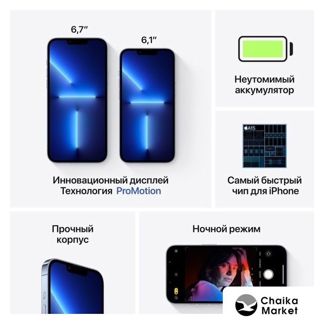 смартфон, Apple iOS, экран 6.7" OLED (1284x2778) 120 Гц, Apple A15 Bionic, ОЗУ 6 ГБ, память 256 ГБ, камера 12 Мп, аккумулятор 4352 мАч, моноблок, влагозащита IP68