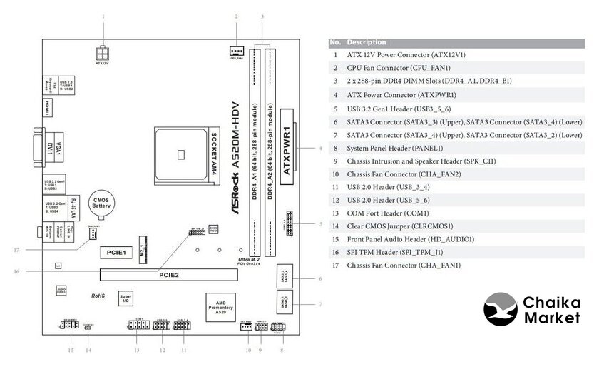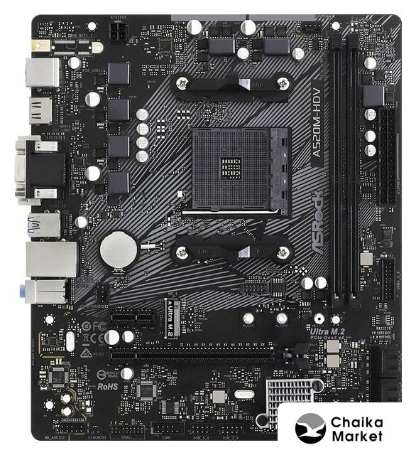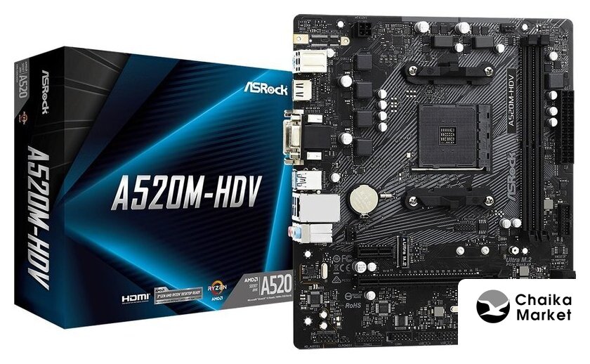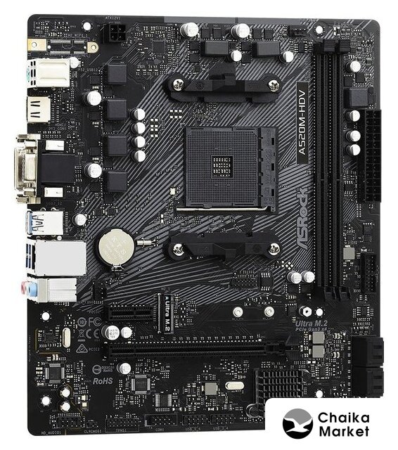 mATX, сокет AMD AM4, чипсет AMD A520, память 2xDDR4 до 4600 МГц, слоты: 1xPCIe x16 3.0, 1xPCIe x1, 1xM.2