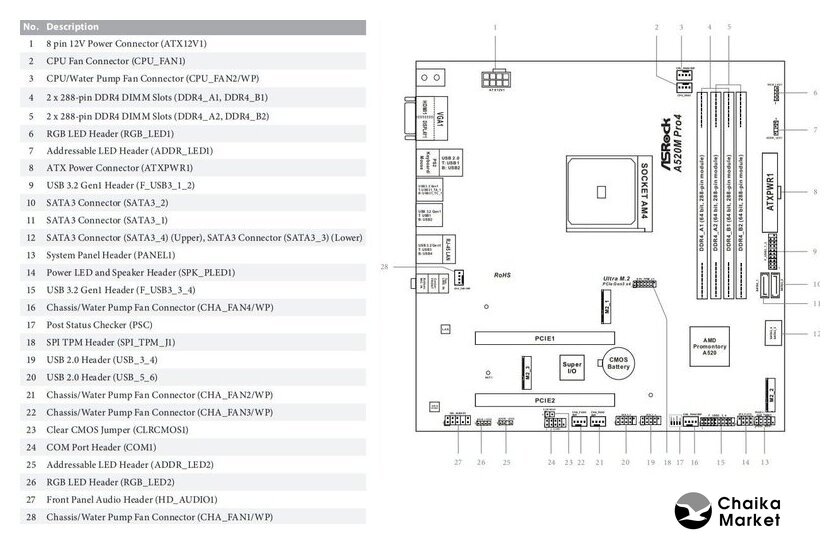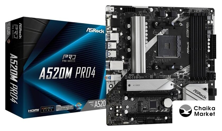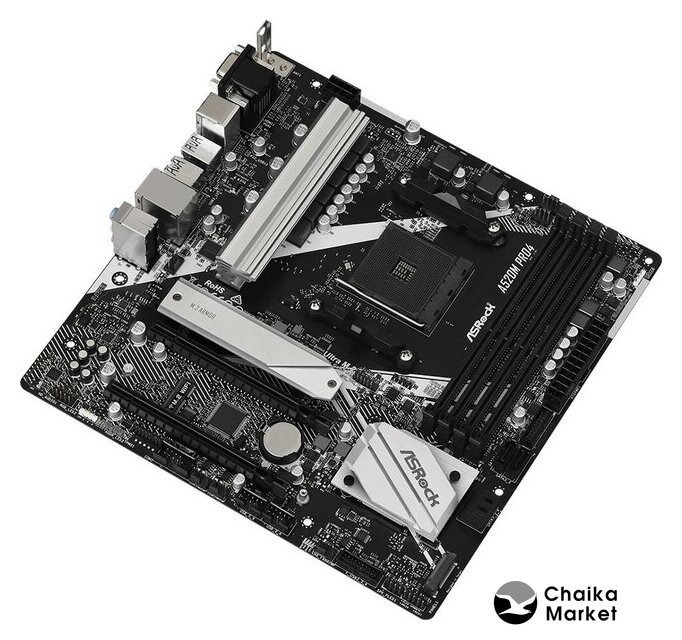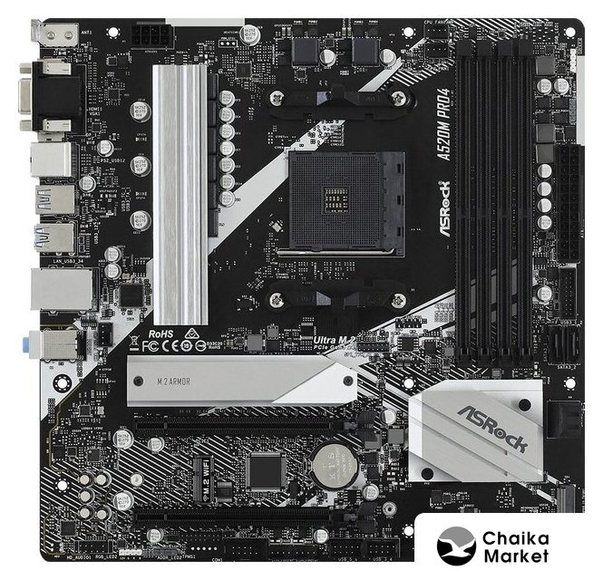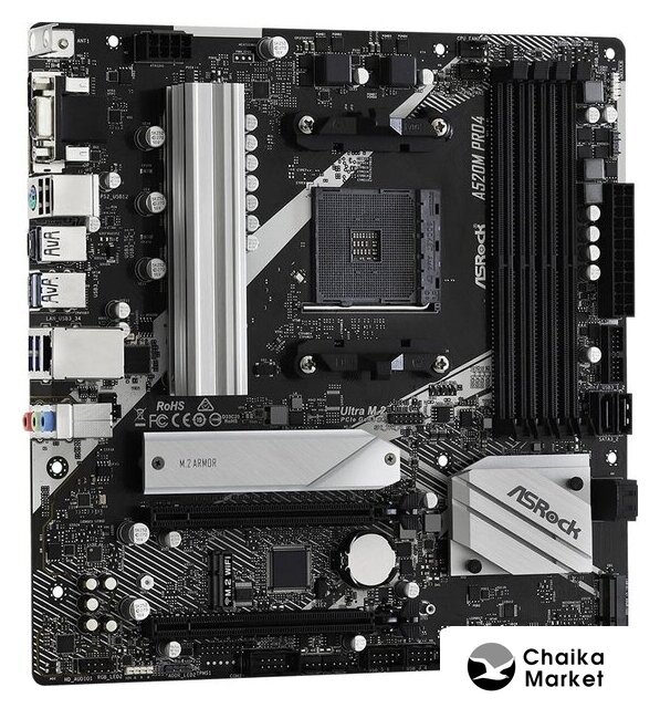 mATX, сокет AMD AM4, чипсет AMD A520, память 4xDDR4 до 4866 МГц, слоты: 1xPCIe x16 3.0, 2xPCIe x1, 1xM.2