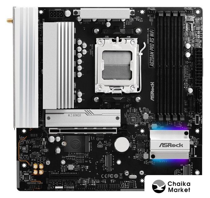 mATX, сокет AMD AM5, чипсет AMD B650, память 2xDDR5 до 7200 МГц, слоты: 1xPCIe x16 4.0, 1xPCIe x1, 2xM.2, 802.11ax (Wi-Fi 6)+Bluetooth 5.2