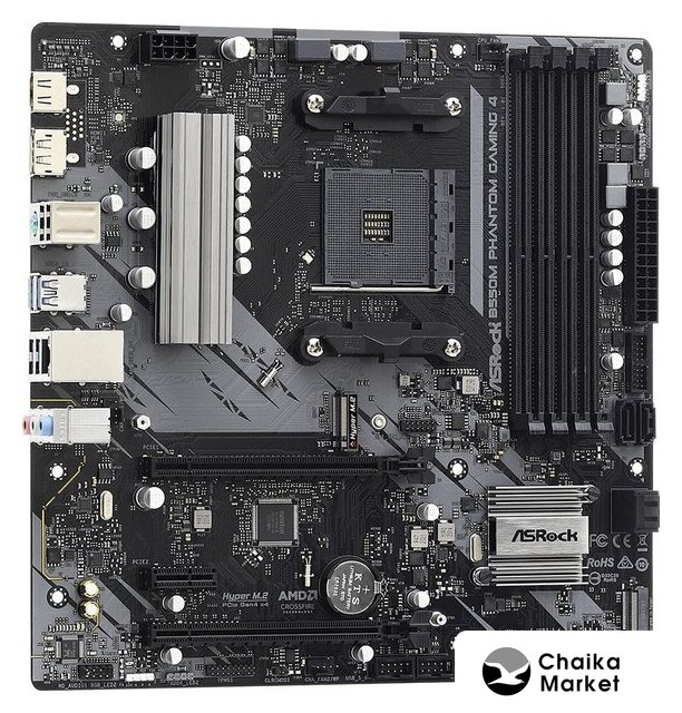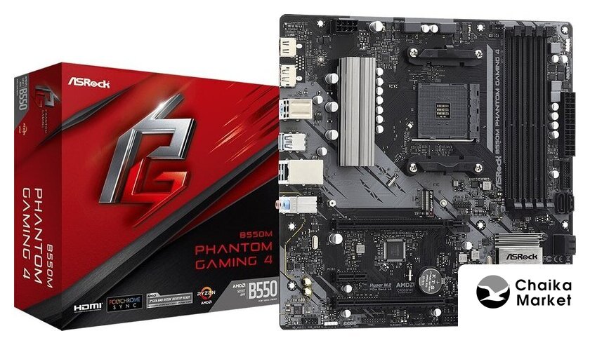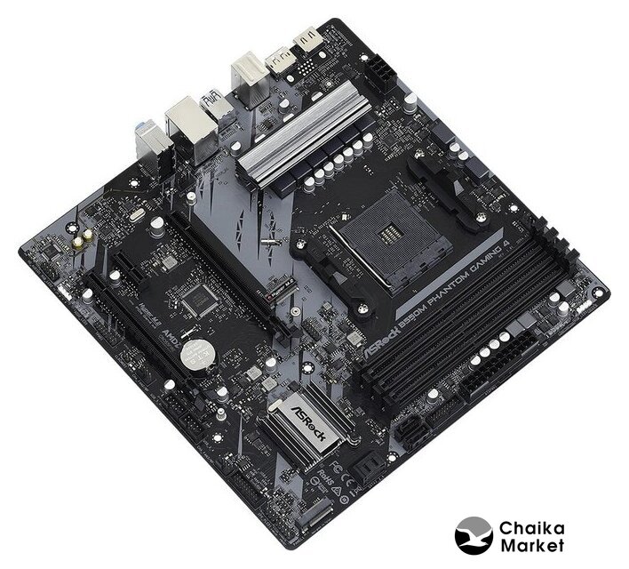 mATX, сокет AMD AM4, чипсет AMD B550, память 4xDDR4 до 4733 МГц, слоты: 2xPCIe x16 4.0 и 3.0, 1xPCIe x1, 2xM.2