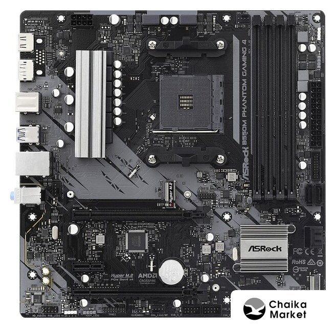 mATX, сокет AMD AM4, чипсет AMD B550, память 4xDDR4 до 4400 МГц, слоты: 1xPCIe x16 4.0 и 3.0, 2xPCIe x1, 2xM.2