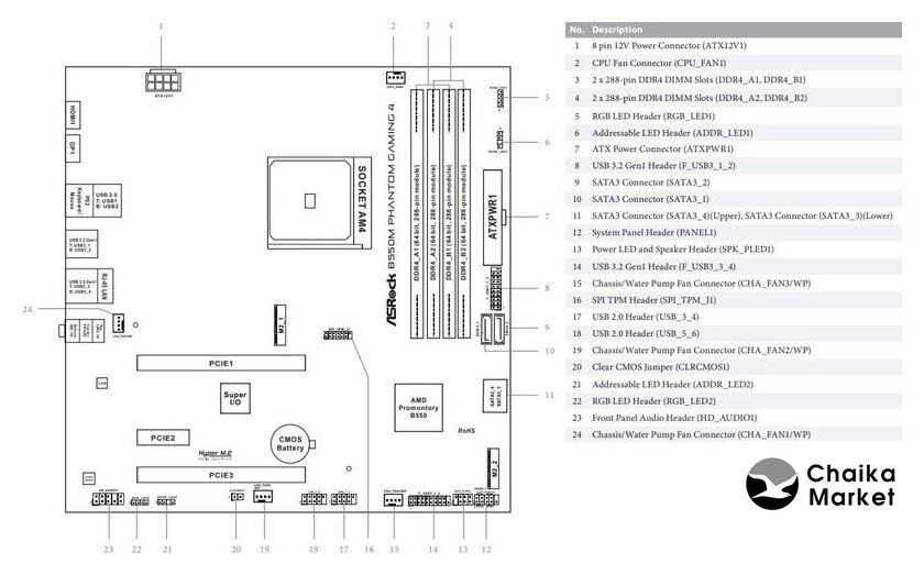 Описание внутренних разъемов | - 1 x SPI TPM- 1 x Индикатор питания и разъем динамика- 2 x Разъём RGB LED*- 2 x Управляемый разъём LED s**- 1 x Разъем для подключения вентиляторов процессора (4-pin)***- 3 x Разъем вентилятора шасси / водяного насоса (4-pin) (Умный контроль скорости вентилятора)****- 1 x 24-контактный разъем питания ATX- 1 x 8-контактный разъем питания 12 В- 1 x Вывод аудио на переднюю панель корпуса- 2 x USB 2.0 (поддержка до четырех USB 2.0) (Защита от электростатических разрядов)- 2 x USB 3.2 Gen1s (поддержка до четырех USB 3.2 Gen1) (Защита от электростатических разрядов)*Поддержка светодиодных лент 12В/3A, 36Вт**Support in total до 5V/3A, 15W LED Strip***Разъёмы CPU Fan поддерживают вентиляторы мощностью до 1A (12 Вт).****Разъём для подключения СВО поддерживает вентиляторы мощностью не более 2A (24Вт).CHA_FAN1/WP, CHA_FAN2/WP и CHA_FAN3/WP определяются автоматически при установки вентиляторов с 3- или 4-пиновыми коннекторами. |