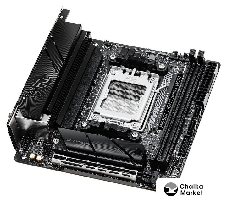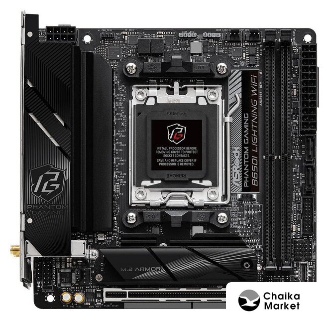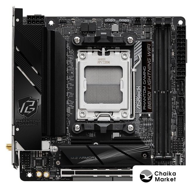 mATX, сокет AMD AM5, чипсет AMD B650, память 4xDDR5 до 7200 МГц, слоты: 2xPCIe x16 4.0, 2xPCIe x1, 2xM.2, 12+2+1 фаз питания