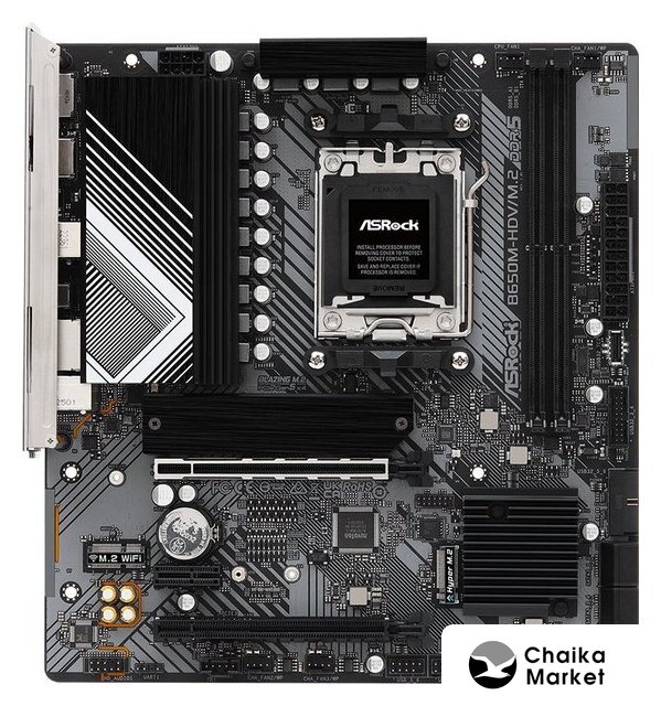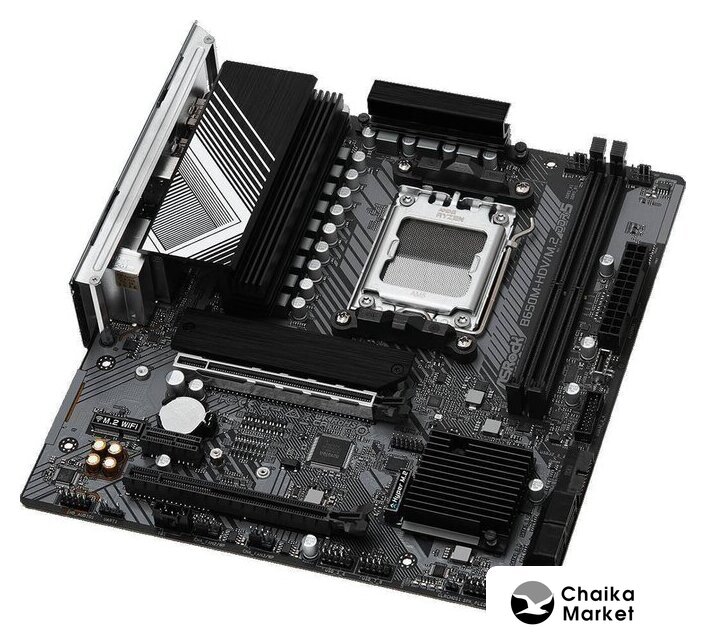 mATX, сокет AMD AM5, чипсет AMD B650, память 4xDDR5 до 7200 МГц, слоты: 2xPCIe x16 4.0, 3xM.2, 6+2+1 фаз питания