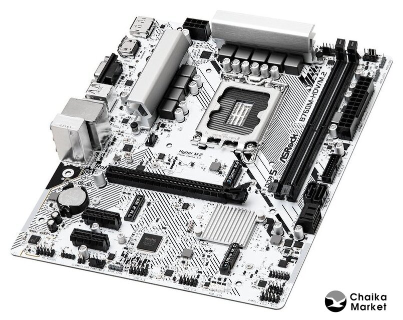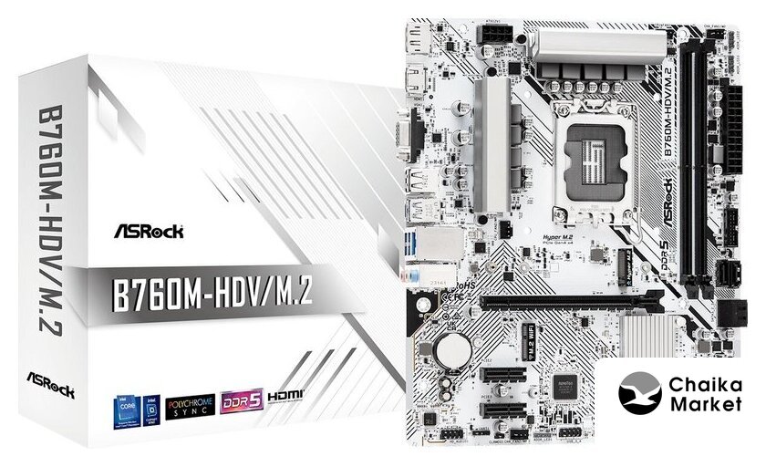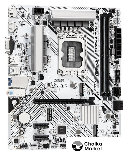 mATX, сокет Intel LGA1700, чипсет Intel B760, память 2xDDR4 до 5333 МГц, слоты: 1xPCIe x16 4.0, 1xPCIe x1, 2xM.2