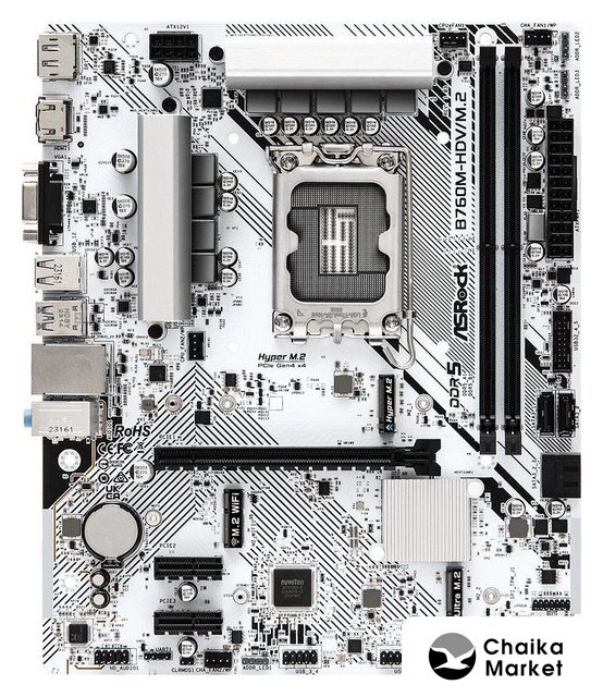 mATX, сокет Intel LGA1700, чипсет Intel B760, память 2xDDR4 до 4600 МГц, слоты: 1xPCIe x16 4.0, 1xPCIe x1, 1xM.2